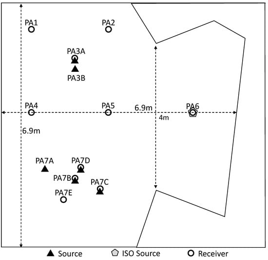Figure 7. Source and receiver points for Studio MV5. - MV5 ISO-3382 Capture: The docecahedron was set to a height of 1.5 m. For ISO-3382, two source–receiver combinations were captured. First with the dodecahedron loudspeaker at PA3A and receivers at PA4, PA5, PA6 and PA7B. Second, with the dodecahedtron at PA6, with receivers PA7B, PA3A, PA4 and PA5. The Eigenmike was set to 1.7 m facing east and KEMAR to 1.5 m facing south.