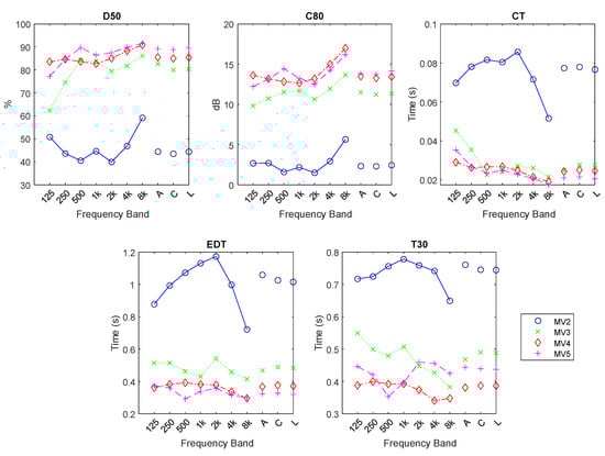 D50 gives us a comparison of the energy in the first 50 ms of the impulse response to the total received energy and is related to subjective speech intelligibility []. We can readily see that studios MV3, MV4 and MV5 have high levels of definition (80% to 90% on average), but this is much lower for MV2, which is the more reverberant space.