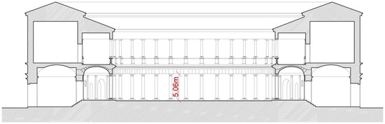 The space used as a concert hall is circular and open-air with a diameter of 30 m (see Figure 2). On its perimeter, there is a 5 m wide porticoed gallery covered with a toroidal vault with basket-handle arches whose height from the keystone to the floor is 5.80 m. On the upper floor, another porticoed gallery crowns the building, this time covered by recent wooden porticoes and wooden coffered ceilings from 1958. The entire solid cylinder enclosing the interior of the arcaded galleries is around 17,907 m3 (see Table 1), with built-in stone with bas-reliefs, half-columns and pediments framing various openings to the interior of the palace.