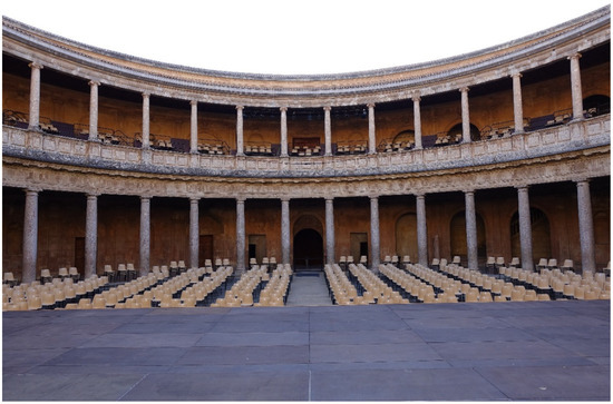 On both sides of the river Darro rise two hills that have seen several cultures throughout the history of the city. The Albaycín hill, where the city started, and the Sabica hill. The fortification of the Alhambra is on the Sabica hill. Inside, the Palace of Charles V is located (see Figure 1), an example of the best Italian Renaissance in Spain. Names such as Enrique de Egas, Diego de Siloé and Pedro Machuca have imprinted the history of the construction of the Palace in the style of the best Italian Renaissance. More information about the building and its historical circumstances can be found in the work by Rosenthal [35] and Brothers [36].