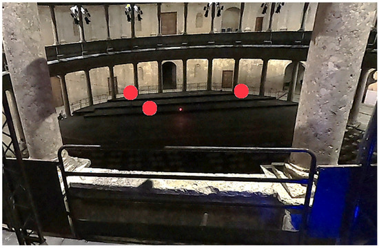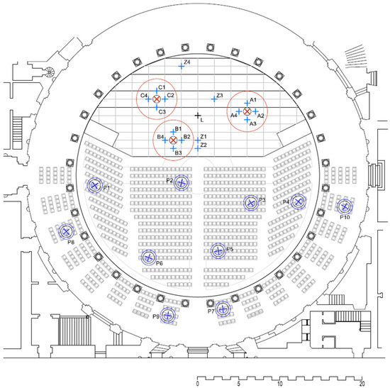 Three source positions were selected on the stage. They were kept for both the audience and the stage measurements. Furthermore, sixteen microphone positions on the stage and ten in the audience (see Figure 5) were selected following the guidelines of the ISO 3382-1 standard [9]. All the source–receiver combinations were measured.