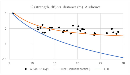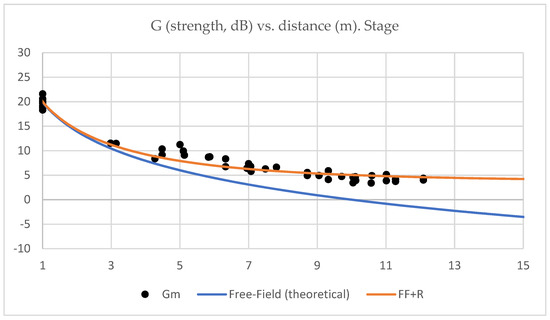 Figure 6 shows the measured strength versus the distance to the source of the measurements in the audience area.
