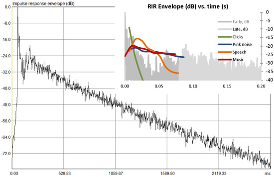 ITDG measured at the central points of the audience was around 60 ms, if we take the first reflection arriving from the parapet, and up to 90 ms with the more energetic reflection from the wall. This can be expected from the geometry and is too much to be a great hall, according to Beranek’s research [46]. Figure 8 shows the energy–time curve of the source in B and the microphone in P2, the most central positions of those measured. The top right of the figure shows a closer look at the first 200 ms. Early energy (t < 80 ms) is in dark grey, late energy (t > 80 ms) in light grey, and there are several detection thresholds for single reflections with different signals (clicks in green, pink noise in blue, speech in orange from the work of Olive and Toole [51], and classical music from Barron [52] in red). Thresholds are included as a reference, as reflections are as important as they are audible. The most energetic reflections arrive in the “late” fraction of the impulse response contributing to a high T30, but a particularly low C80, and every other parameter that segregates early-to-late energy. The main effect on subjective judgements is the lack of intimacy. The downward slope of thresholds means that the later a reflection arrives, the more audible it will be.