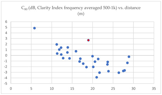 Figure 9 shows the values of C80 versus the source-to-receiver distance. Clarity tends to decrease with distance, with the exception of the farthest positions and the measurement with the source in the C position and the microphone at P6, which is red-coloured (see Figure 5 for the positioning layout)