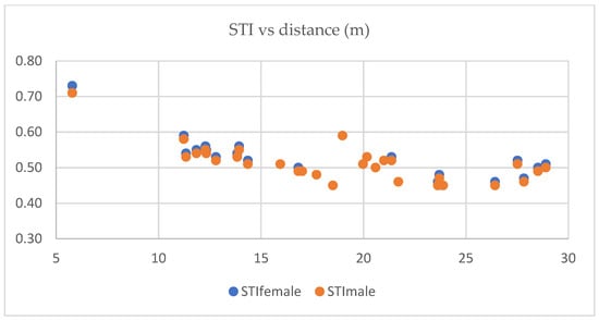 This paper covers the use of the Palace for music but the voice is usually part of the music. The speech transmission index (STI) is based on modulation transfer functions as defined by the IEC 60268-16 standard [34]. The values were calculated for female and male voices using the impulse responses without any corrections due to background noise, meaning the SNR is assumed to be infinite.