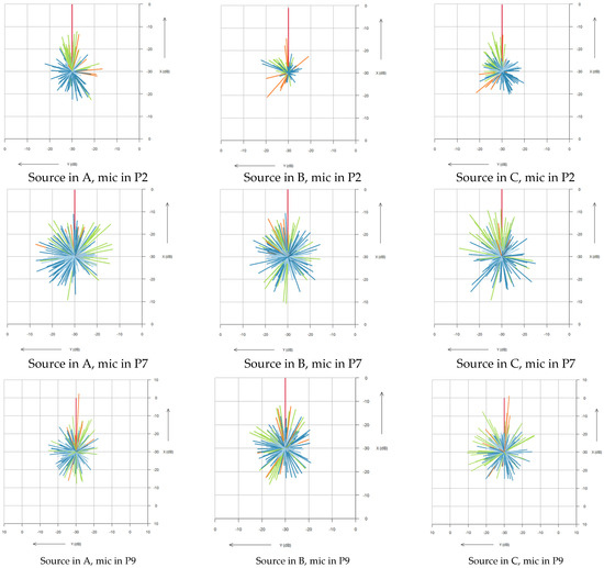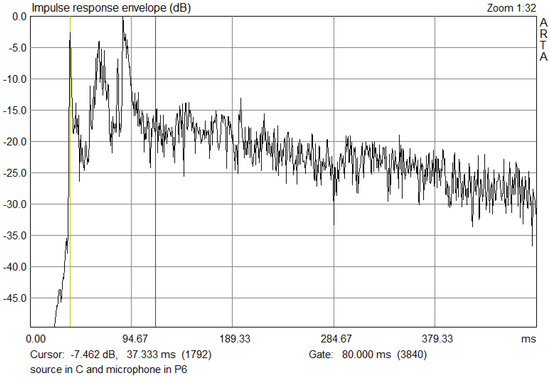 Figure 9 shows a remarkably high C80 value for the C-P6 combination that deserves some explanation. The energy–time curve (Figure 13) shows two groups of strong reflections arriving in the first 80 ms (yellow and red lines) causing a C80 and STI rise. Figure 14 shows the directions of arrival for the same combination.