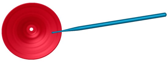 The CAD geometry of an 8-inch (20.32 cm) splash Zildjian cymbal [] is designed along with the geometry of a wooden drumstick [], as shown in Figure 1. The diameter of the bell for the splash cymbal is 78 mm and its inner diameter is 12.3 mm. The thickness from the centre to the edge of the cymbal varies and at the edge becomes 0.5 mm. The length of the drumstick is 39.4 cm. The cymbal is modelled as a deformable body, while the drumstick is modelled as a non-deformable rigid body.