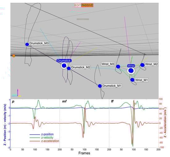 Figure 3 (bottom) illustrates the z-position, velocity, and acceleration of the drumstick head for 200 frames around its lowest z-position for three representative free strokes, namely, p, mf, ff, while Figure 3 (top) displays the gesture traces of all reflective markers and centroids of rigid bodies for the last, hardest stroke.