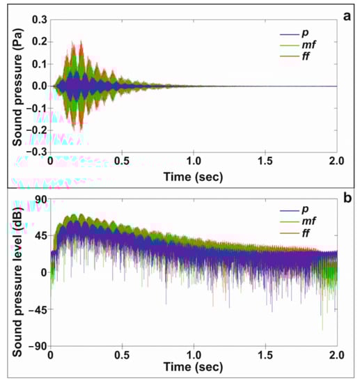 Computed (a) sound pressure and (b) SPL values of the emitted sound for the three progressively intensified free strokes p, mf, ff.
