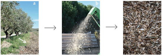 Sequence adopted to obtain the by-product from olive tree pruning: (a) pruning product (from pruning waste left on the fields); (b) pruning chipping; (c) obtained by-product.