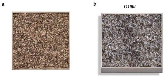 The loose olive tree pruning chips were used, without any binder, to fully fill 300 × 300 × 44 mm birch plywood frames (Figure 2), which constituted the basic module. A birch plywood box was constructed with wood processing waste of a thickness of 6 mm. Thus, the thickness of the cavity filled with loose olive tree pruning chips was equal to d = 38 mm. The basic module was labeled with the initialism O100l, to indicate a composition of 100% loose olive tree pruning chips.