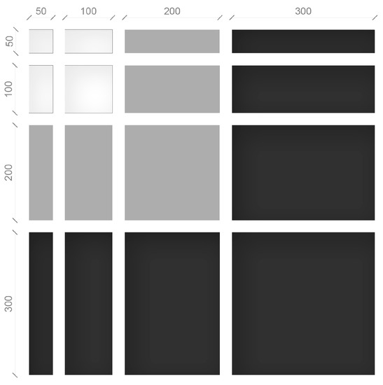 Sixteen differently shaped sub modules were made using the same material and with the same frame thickness and were used in different configurations inside the frame of the basic module. Figure 3 shows the sizes of the sub-modules, which are differentiated into black, gray, and white colors according to their maximum size. Specifically, the maximum base dimensions, 300 × 300 mm, are shown in black; the dimensions adopted for the decomposition of the base frames into 200 × 200 mm are shown in gray; and the dimensions considered for a further decomposition, 100 × 100 mm, are shown in white.