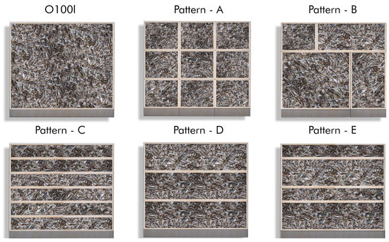 The aim of this research was to connect architecture, innovation, and sustainability by focusing on the recycling of olive tree pruning waste in the building–architectural field. This material has never been fully characterized before by taking into account its aesthetic design value, except for in a few studies in which only differentiated olive leaves or wood were examined considering traditional measurements based on the impedance tube approach [6,14]. In this study, a small-scale reverberation room (SSRR) was used to allow several design configurations to be investigated [17]. Thus, the potential of the materials and components derived from olive tree pruning chips was investigated for application in construction and architecture through the evaluation of their acoustic and aesthetic performance. This latter aspect should not be underestimated, because a sound-absorbing component can have an aesthetic appeal for indoor applications and affect the perception of the indoor environmental quality in general [18]. Moreover, the acoustics community might be interested in having another sustainable decorative type of sound absorber that could have different acoustic performances when arranged in different patterns. It has in fact been shown that using different patterns can significantly affect the acoustic parameters of an indoor space [19,20].