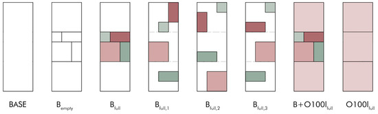 Pattern-B was chosen for acoustic characterization because of the dimensional variation of its sub-modules. This pattern allowed more flexibility to be taken into consideration in the combinations of the sub-modules over the reference area (BASE). Different configurations of the pattern were analyzed, with the sides enclosing a base area of 0.27 m2, by varying the exposed area of the porous material and the position of the individual sub-modules to investigate the effects on the frequency absorption values. The first configuration (Figure 5) represents an acoustically hard base of 6 mm of plywood (BASE); the second is an empty pattern with the acoustically hard sub-module boxes located in the center of the BASE configuration (Bempty); the third is based on the Bempty configuration, with the pattern being filled with olive tree pruning wood chips (B full). Finally, five sub-module configurations were differentiated: Bfull,1, Bfull,2, Bfull,3, B + O100lfull (Bfull + 2 full basic O100l modules), and O100lfull (3 full basic O100l modules). Figure 6 shows the eight configurations that were analyzed by means of the SSRR method; the positions of the sources, with respect to the individual full or empty frames, can be also deduced.
