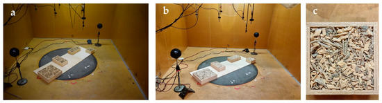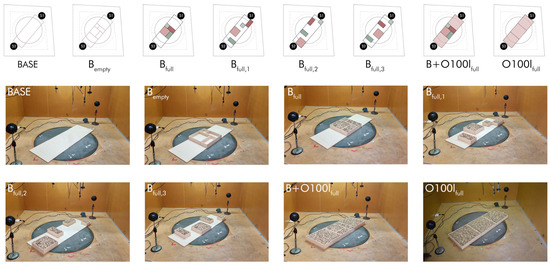- Measurement of the sound absorption in the small-scale reverberation room (SSRR) [17] and evaluation of the sensitivity of the absorption coefficients, using the ISO 354 measurement method [21], by varying the position of the test specimens on the floor. The analyzed samples were differentiated into configurations characterized by the composition of the sub-modules, namely, BASE, Bempty, Bfull, Bfull,1, Bfull,2, Bfull,3, B + O100lfull, and O100lfull.