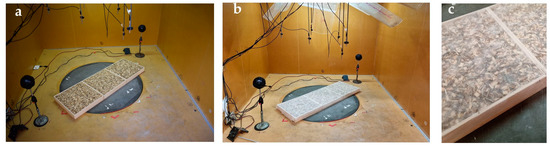 The small-scale reverberation room (SSRR) in the Department of Energy (DENERG) at the Politecnico di Torino was used for the measurement of the sound absorption coefficient, according to the ISO 354:2003 procedure [21] and the ASTM C423 [25] standard. This room is shown in Figure 10a and it was described in detail and validated in [17]. This room is a 1:5 scale reproduction of the Instituto Nazionale di Ricerca Metrologica (INRiM) reverberation room, which requires a sample area of 10 to 12 m2. Therefore, over the years, a methodology has been sought that is as assimilable and accurate as that of the reverberation room but, at the same time, which has a lower resource and economic consumption. The use of the SSRR allows smaller sample sizes than 10–12 m2 to be used, but at the same time maintains the diffuse field conditions of the method. However, this methodology suffers from certain disadvantages, such as a lack of field diffusivity in the mid to low frequencies and diffraction due to the finite size of the experimental samples, which generates the so-called edge effects. The SSRR measurement methodology specifically consists of an exponential sweep, from 100 to 25,000 Hz, which is a digital signal that is sent to a sound card, amplified and generated by the omnidirectional dodecahedral sound sources in the room. The microphones record the audio, and the signal is then sent to the used computer. The signal generation and recording operations are carried out twice during a measurement, that is, once for the first source (S1) and once for the second one (S2) (see Figure 10a,b). Measurements are recorded for the six microphone positions for both sources, for a total of twelve measurements, as required by ISO 354. To this aim, the measurement chain consists of six 1/400 BSWA Tech MPA451 microphones and ICP104 (BSWA Technology Co., Ltd., Beijing, China); two ITA High-Frequency Dodecahedron Loudspeakers, with their specific ITA power amplifiers (ITA-RWTH, Aachen, Germany); and a Roland Octa-Capture UA-1010 sound card (Roland Corporation, Osaka, Japan).