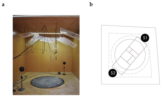 (a) Empty small-scale reverberation room; (b) example of the configuration of the SSRR floor plan, with source 1 (S1) on the right and source 2 (S2) on the left.