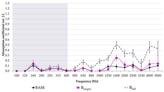 The obtained random incidence sound absorption coefficients of the BASE, Bempty, and Bfull configurations, together with the standard deviations of the results for each sample configuration.