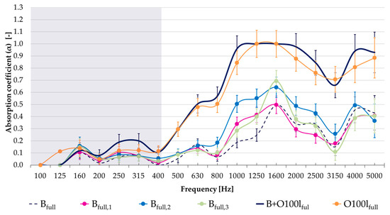 The obtained random incidence sound absorption coefficients of the Bfull, Bfull,1, Bfull,2, Bfull,3, B + O100lfull, and O100lfull configurations, together with the standard deviations of the results of each sample configuration.