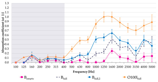 The obtained random incidence sound absorption coefficients of the Bempty, Bfull, Bfull,2, and O100lfull configurations, together with the standard deviations of the results of each sample configuration.