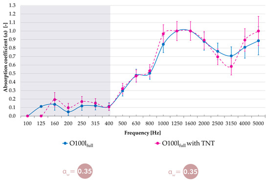 The results are compatible, and the use of TNT (Figure 7b) resulted in a further decrease in the minimum at 3150 Hz from 0.70 to just under 0.60, but also in a switch above 3150 Hz with higher absorption values than in the sample without the TNT (Figure 7a). However, even in this case, the values of αw are 0.35.