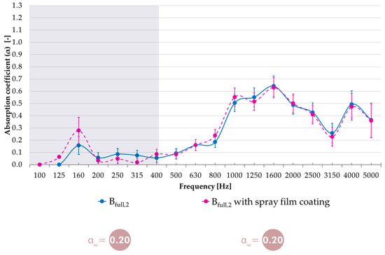 The obtained random incidence sound absorption coefficients from Bfull,2 and Bfull,2 with the spray film coating and the standard deviations.