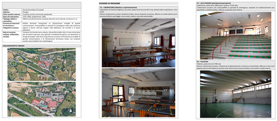 The Investigation Protocol for the Acoustic and Subjective Analysis was implemented in the selection of nine schools distributed in the Italian territory and defined as case studies. The environments were studied in order to identify the parameters to be measured, relevant to the considered scenario. These took into account the main factors with acoustic effects, including the presence of facilities, adjacent rooms, exposure to the road or other external sound sources.