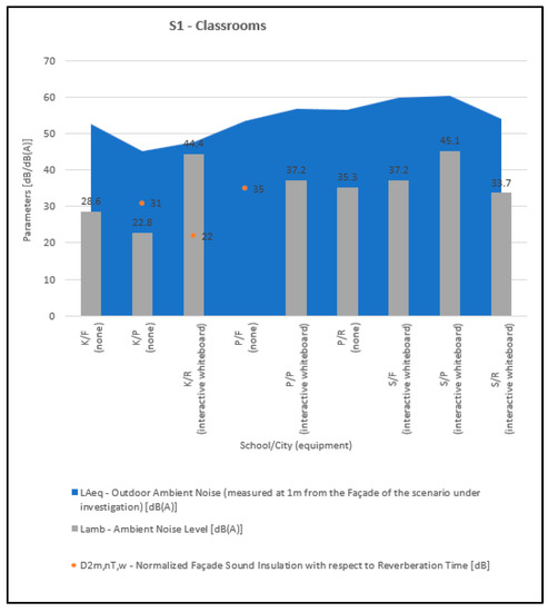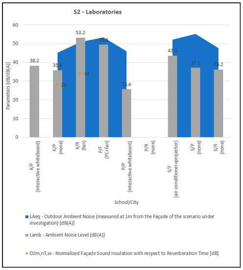 The schools selected as case studies are placed in areas assessed in classes from I to IV, according with the Municipal Noise Classification Plans of the three cities. Mainly, the school layouts favour the exposure of school environments on courtyards or noise-reduced streets. In order to assess the noise due to sound sources located outside the building (e.g., infrastructures, production buildings, school gardens, etc.), the Protocol defines different types of measurements, alternative to each other: outdoor ambient noise at 1 m from the facade of the scenario under investigation, LAeq; ambient noise level, Lamb; and normalised facade sound insulation with respect to reverberation time, D2m,nT. In Figure 2 and Figure 3, the parameters measured to assess the external noise transmitted within the different scenarios are reported, respectively, for classroom (S1) and laboratory (S2). Since the ambient noise parameter, Lamb, takes into account noise coming from the outside, together with that produced by the equipment inside the rooms, the system in operation during the measurement is reported in the figures.