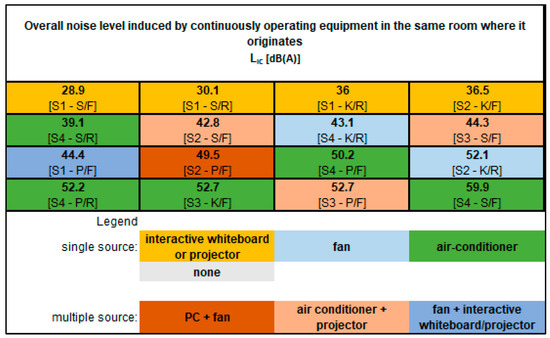 It is observed that the operation of the interactive whiteboard results in a highly variable noise level depending on the type of fan of the projector system. In particular, the noise level (LIC) of an interactive whiteboard can vary in a range of less than 30 dB(A), for the most silent systems, to above 35 dB(A), for the noisier ones, as reported in Figure 4. Each box indicates the noise level of the source or multiple sources, where colours correspond to different combinations of sound sources in the scenario under investigation, as shown in the legend: the scenario (e.g., “S1” for the classroom) and its location (e.g., “S/F” for the secondary school in Florence) are reported in square brackets. It should be noted that this type of equipment is used during many teaching activities that take place mainly in classrooms, laboratories and the auditorium.