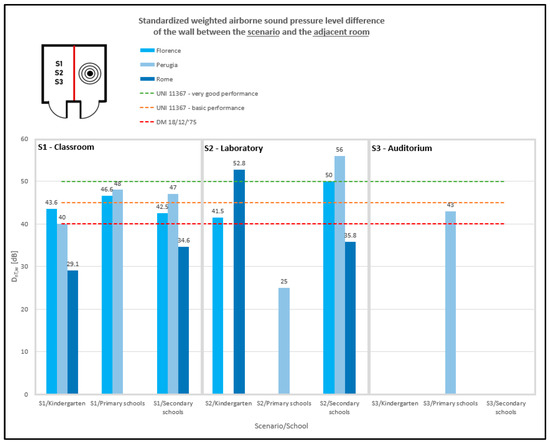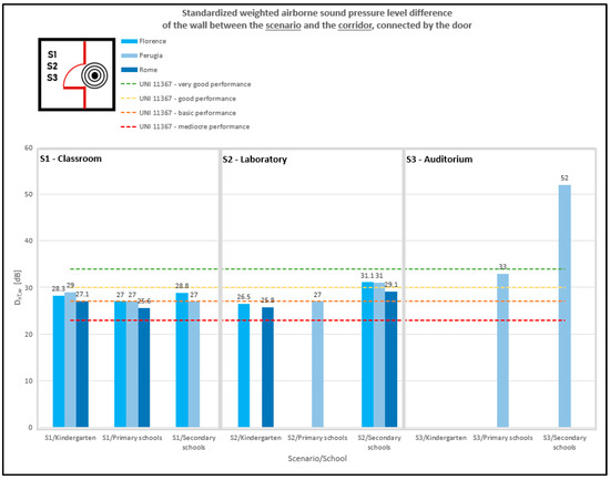 Regarding noise transmission, passive acoustic requirements of the building elements for classrooms (S1), laboratories (S2) and auditorium (S3) were investigated and are reported in this paragraph. The standardised weighted airborne sound pressure level difference of the walls between scenarios S1, S2 and S3 and the adjacent rooms is on average above 40 dB, except for four scenarios where it is between 25 dB and 35 dB. These latter performances mainly refer to partitions installed later to split the room into two or more separate rooms. In Figure 5, the sound insulation of the wall between the scenario and the adjacent room is reported together with the reference limits, whereas Figure 6 shows the values of standardised weighted airborne sound pressure level difference of the wall between the scenario and the corridor.