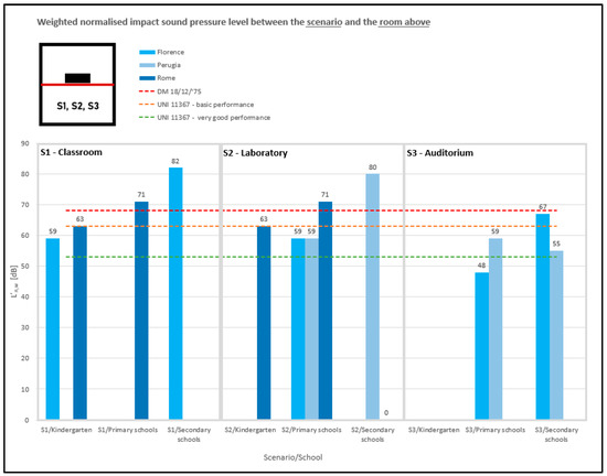 The weighted normalised impact sound pressure level has been measured in eleven rooms of three different scenarios (S1, S2, S3). Out of the eleven, only one case complied with the “very good” performance, six complied with the “basic” performance, whereas the remaining four scenarios were characterised by a “mediocre” performance between 63 and 82 dB.