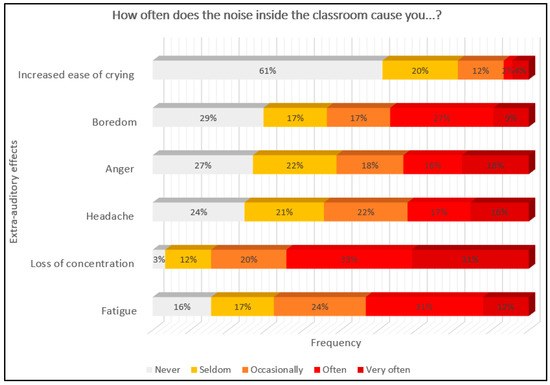 Extra-auditory effects resulting from noise exposure that occur most frequently in the refectory are headaches (35%), fatigue and boredom (23%). Other aspects considered less frequent are nausea (13%), anger and increased ease of crying (10%).