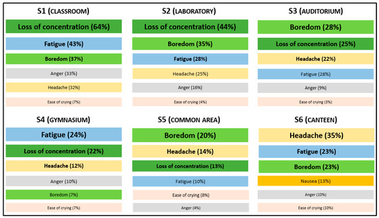 The sample considered for the auditorium (S3) is small. It can be noted that the presence of acoustic treatments determines a variable RT between 0.9 s and 1.2 s and an STI equal to or greater than 0.6, in contrast to the untreated scenario, where the RT is greater than 2 s and the STI is less than 0.5. The main sound sources detected by students inside the auditorium are related to noise generated by student activity within the room. Moreover, the rooms are defined as reverberant. The students state that noise exposure in classrooms mainly determines boredom, loss of concentration and headaches. Therefore, optimal reverberation time is required to reduce high noise levels.
