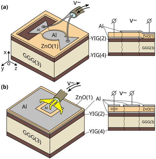 Schemes of the HBAR consisting of YIG(2)-GGG(3)-YIG(4) and piezoelectric transducers based on ZnO films (1) with different shapes of Al electrodes and different types of contact with the bottom electrode (a) with ohmic contact (b) with capacitive contact.