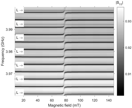 Frequency and magnetic field dependencies of |S11(f, H)| for device 1. The arrows show the positions of the resonant frequencies of the longitudinal (L) AW, three of which correspond to the frequencies in the inset in Figure 2.