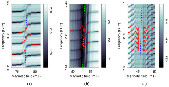 Frequency and magnetic field dependencies of |S11(f, H0)| for the devices under study: (a) for device 1; (b) for device 2; (c) for device 3. The red lines are the results of the theoretical calculation with the fitting parameters of Table 1. The dashed lines are the positions of the lines fMER(H0).