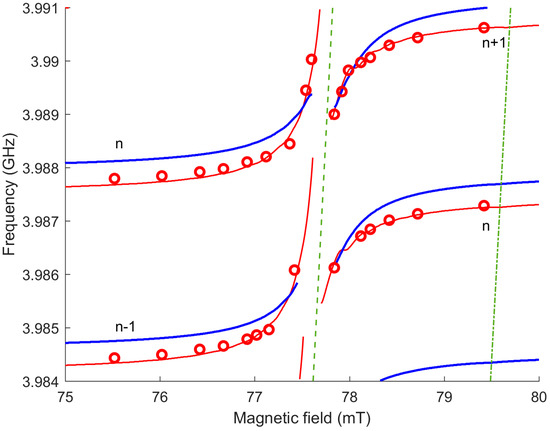 Magnetic field dependencies of resonance frequencies for device 1. The circles indicate the positions of the resonances in the experimental data from Figure 4a; red lines—approximation of these data by a model with two 15 µm YIG layers; blue lines—the result of the calculation of the model with only one YIG layer of 30 μm; the green dotted line is the MER line; the green dash-dotted line is the FMR line. The calculations were performed for D = 4.5 × 10−14 mT·m2.