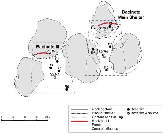Location of Bacinete main shelter and the Bacinete III shelter in the core rock art area. The approximate sound source (S) and receiver (R) positions set for registering impulse responses are shown. Source: Prepared by the authors based on Lazarich et al. [21] (Figure 5).