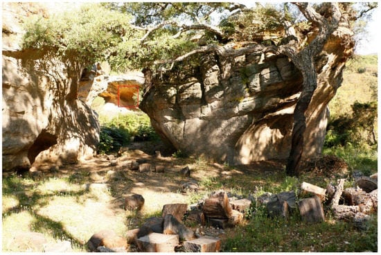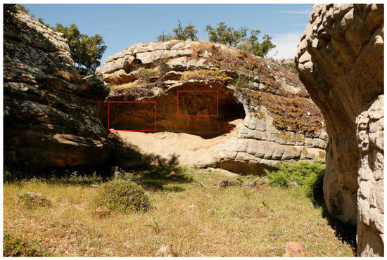 The Bacinete rock art complex is located in the Niño mountain range, in the southeast of the province of Cádiz, Spain. Rock art was produced in this region over millennia, from the Upper Palaeolithic [22,23] to the Late Middle Ages [24]. The site is close to the so-called Bacinete mountain pass at an altitude of 180 m in the Palmones river basin and not far from the sea. The shelters are in an area in which visibility of the surroundings is limited. The only exception is one shelter located at a distance from the others, Shelter I, which has extensive views across the landscape to Algeciras Bay and the Rock of Gibraltar [21] (pp. 494, 499). The site is easily accessed and one of the remarkable features of the area is the spectacular geological rock formations of aljibe sandstone in which the painted shelters are inserted [21] (p. 492). This type of rock is prone to wind erosion and its effects on the sandstone panels are evident. That, and the influence of water and other factors, has resulted in the fading of the paintings and even the possible disappearance of some of them.