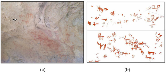 The second reason the main shelter stands out is that the motifs painted in it belong to two distinct styles or rock art traditions: an earlier Laguna de la Janda style, also called semi-naturalist style, and the Schematic style (Figure 3). The Laguna de la Janda style owes its name to the location of what was one of the largest wetlands on the southern Iberian Peninsula until it was drained in the late 1960s [30] (pp. 189–191), [31] (p. 389). In terms of chronology, Solís argues that the earlier style may have originated with the last hunter-gatherer populations in the area and continued after the adoption of agriculture and husbandry [29] (p. 34), the latter being the appropriate date for Lazarich et al. [20] (p. 6), [21]. Regarding the Schematic style, superimpositions make it clear that it is later in time, and both teams date it to the Neolithic and Chalcolithic periods [29] (pp. 45, 150). In addition to a large number of figures and the two distinctive styles, the main shelter is different from all others in the complex because its paintings were produced in at least five different periods. The earliest motifs represent people and animals (principally cervids) that have been classified as Laguna de la Janda style. More motifs were painted later, albeit with a higher degree of schematism. The trend towards schematism is even more marked in the third period, when other motif types, such as dots and different animal species, including canids, were added. More signs possibly symbolising anthropomorphs, as well as dots, were inserted in a fourth phase, and this was followed by a final moment in which the anthropomorphs, zoomorphs (all very schematic) and signs were painted on the surface of the shelter’s ceiling and not on the rear wall [29] (pp. 145–146). Spatially, the motifs of the main shelter are located in an area of several metres in which two sectors have been identified. The first comprises the entire rear wall of the shelter, where 13 panels have been distinguished. Sector 2, with only one panel, is on the ceiling and corresponds, as mentioned above, to the most recent painting phase [29] (pp. 106–130).