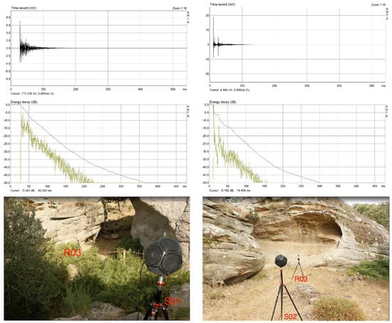 An omnidirectional sound source (an IAG DD4 mini dodecahedral loudspeaker together with an IAG AP4GB power amplifier) was used to emit the excitation signal, a 12-s long exponential sine-sweep covering from 50 Hz to 20 kHz. Two positions of the sound source (S) were considered at each rock art site. These were selected according not only to the size and morphology of each of the sites but also to the location of the rock art. Six receiver points (R) were also distributed throughout the “zones of influence” of each source position. For the selection of the receiver locations, the non-diffuse condition of the sites was considered, trying to set enough test points to register the acoustics of the different “zones” created by the particular spatial configurations of the rocks. Inevitably, the number of S-R combinations included in the study was limited due to the time allowed for accessing the sites, which are on private land. Information about the S-R combinations analysed is provided in Figure 1, Table 1 and Table 2. Furthermore, the spatial limitations caused by the height of the rocks, as well as the presence of vegetation and other particular elements, such as the protective iron fence installed around the main shelter, needed to be considered. It is also important to reiterate that there is no archaeological evidence regarding the use of the sites, meaning that details of the positioning of the sound source, the audience arrangement or the number of attendees in prehistory are not available. All these peculiarities meant that the equipment positioning had to be flexible, not only in the selection of the S-R locations but also in their height. For the height of the transducers, we worked with the hypothesis of a “standing audience”. Only from that position were both the rock art panel and the sound source on the “stage” visible from all parts of the “audience area”. Therefore, as far as practicable, the sound source was set at a height of 1.50 m and the receivers at a height of 1.40–1.50 m, which are assumed to be close enough to the average height of the ears of a standing speaker/listener [51,52]. Measurements were taken in unoccupied conditions.