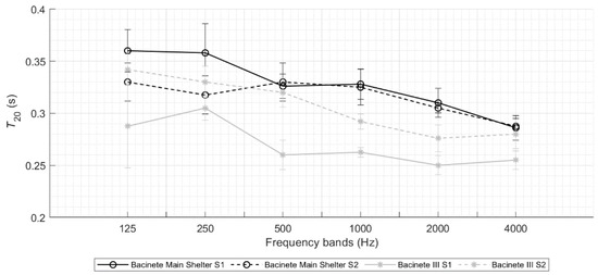 Mid values measured and averaged according to ISO 3382-1 [35] in the Bacinete main shelter.