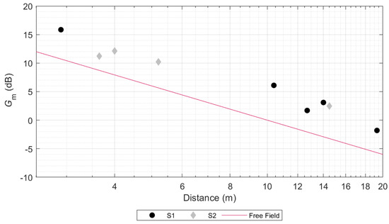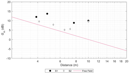 Sound strength, Gm (dB), spectrally averaged values calculated from the measured IR in the Bacinete main shelter. The theoretical free field propagation is represented by the red line.