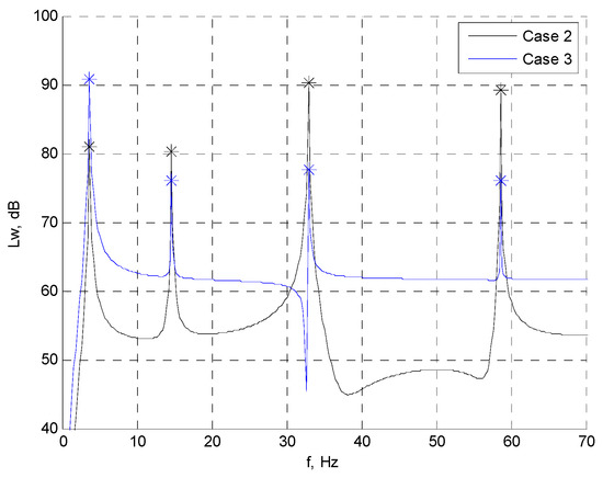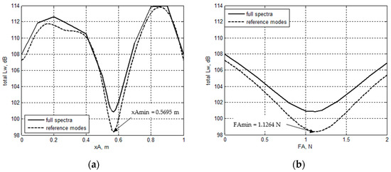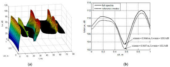 3.3. Optimal Position and Force Amplitude of the Actuator for Minimum Total Sound Power Level
