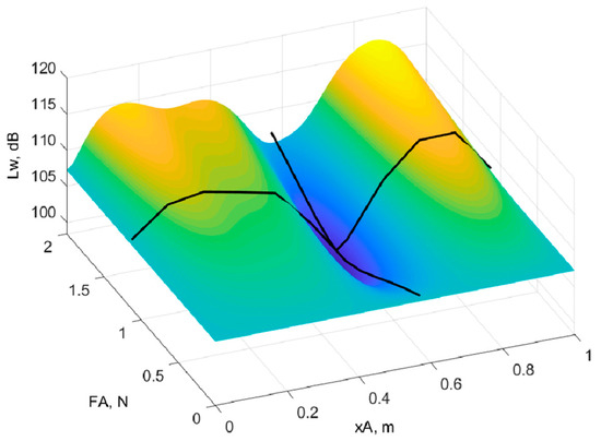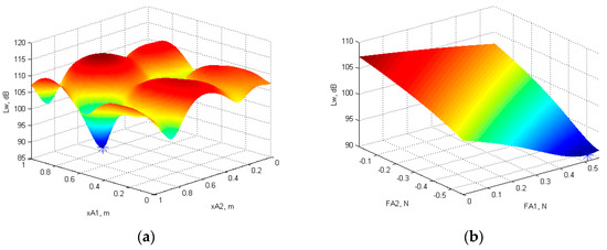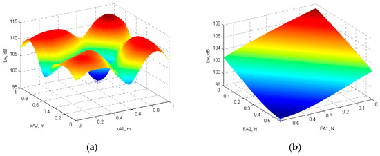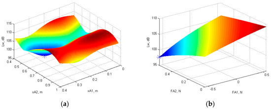 3.4. Optimal Position and Force Amplitude of Two Actuators for Minimum Total Sound Power Level