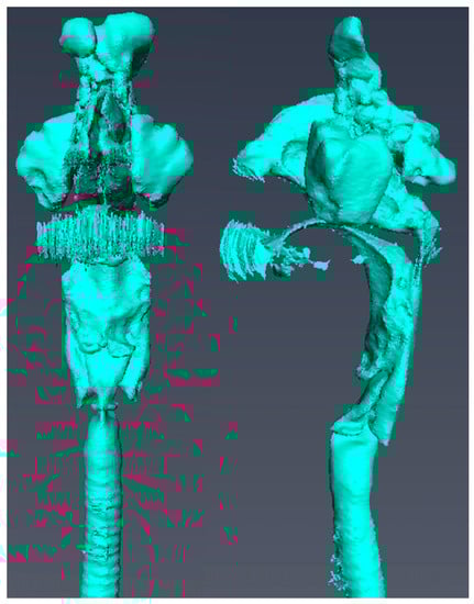 To conduct acoustic analysis, we created a mesh model from the vocal tract model using the boundary element method. To equalize and adjust the mesh size and remove unnecessary meshes, a direct modeler (Ansys SpaceClaim, version 2021R1; ANSYS, Canonsburg, PA, USA) was used to modify the vocal tract model, after which the meshes of the nostril and oral aperture were removed. Next, the nasal and oral cavities and tracheal bifurcation were opened. To aid the mesh creation, we applied triangular elements (smallest mesh size, 2 mm) and carried out the analysis on a Dell Precision T3610 workstation (Inter Xeon E-1650 3.5 GHz) with the WAON software package (version 4.55; Cybernet, Tokyo, Japan) (Figure 2). We used mesh sizes of 19.6 and 39.2 mm for /i/ and /u/, respectively, based on a previous study [] that recommended a mesh size smaller than 1/6 of the wavelength of the sound wave of the analysis frequency for a body temperature of 37 °C (speed of sound, 352.85 m/s). For the creation of a vocal tract model that did not include the nasal cavity and sinuses, these were separated at the section in which a cross-sectional area of the nasal coupling was minimized.