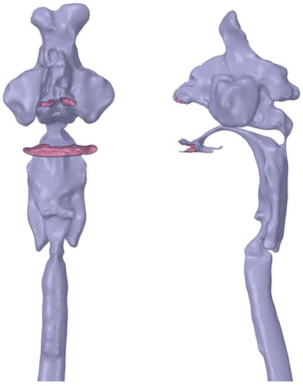 - A surface mesh model for analysis is shown. The nostrils, oral cavity, and tracheal bifurcation are opened.