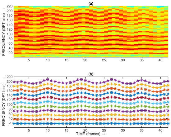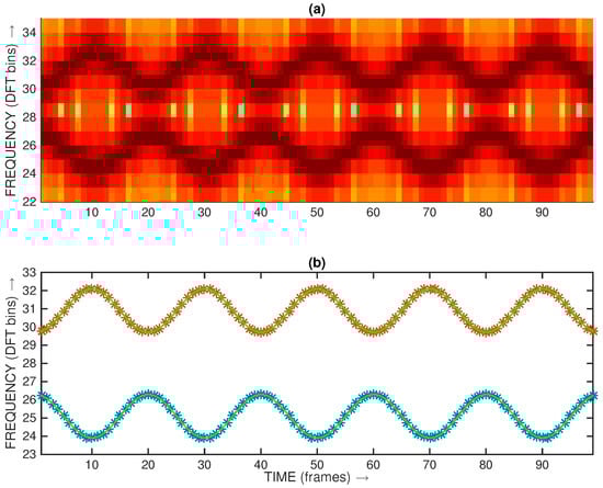 Figure 1, which represents the spectrogram of two frequency-modulated (FM) sinusoids in close proximity. The granularity in the spectrogram representation is a consequence—and limitation—of the underlying discrete Fourier transform (DFT) frequency resolution, which hinders the detailed frequency contours of the FM sinusoids. Plot (