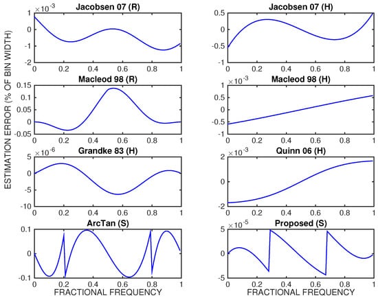 Figure 6 represents the deterministic estimation error due to structural bias, as a percent of the DFT bin width, which is associated with eight of the tested frequency estimators in the absence of harmonic and noise interferences, when