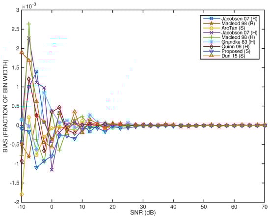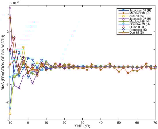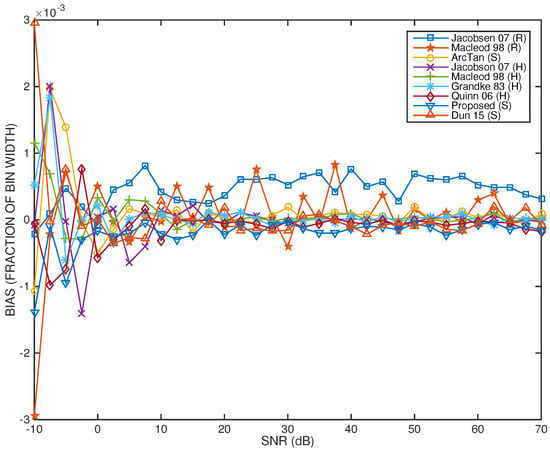 Regarding the RMSE performance curves, as expected, the asymptotic behavior initiates for even lower SNR values, relative to the previous test case. On the other hand, it can be seen that all performance curves collapse to three major trends. The worst-performing trend involves only the Macleod98(R) frequency estimator, whose RMSE performance saturates to around 3.5% of the DFT bin width for SNR > 5 dB. The next best-performing trend groups the Jacobsen07(R), the Dun15(S), and the ArcTan(S) estimators. The best-performing group of frequency estimators includes the Jacobsen07(H), the Proposed(S), the Grandke83(H), the Quinn06(H), and the Macleod98(H) estimators. The RMSE performance of these estimators saturates to around 0.4% of the bin width for SNR > 20 dB.